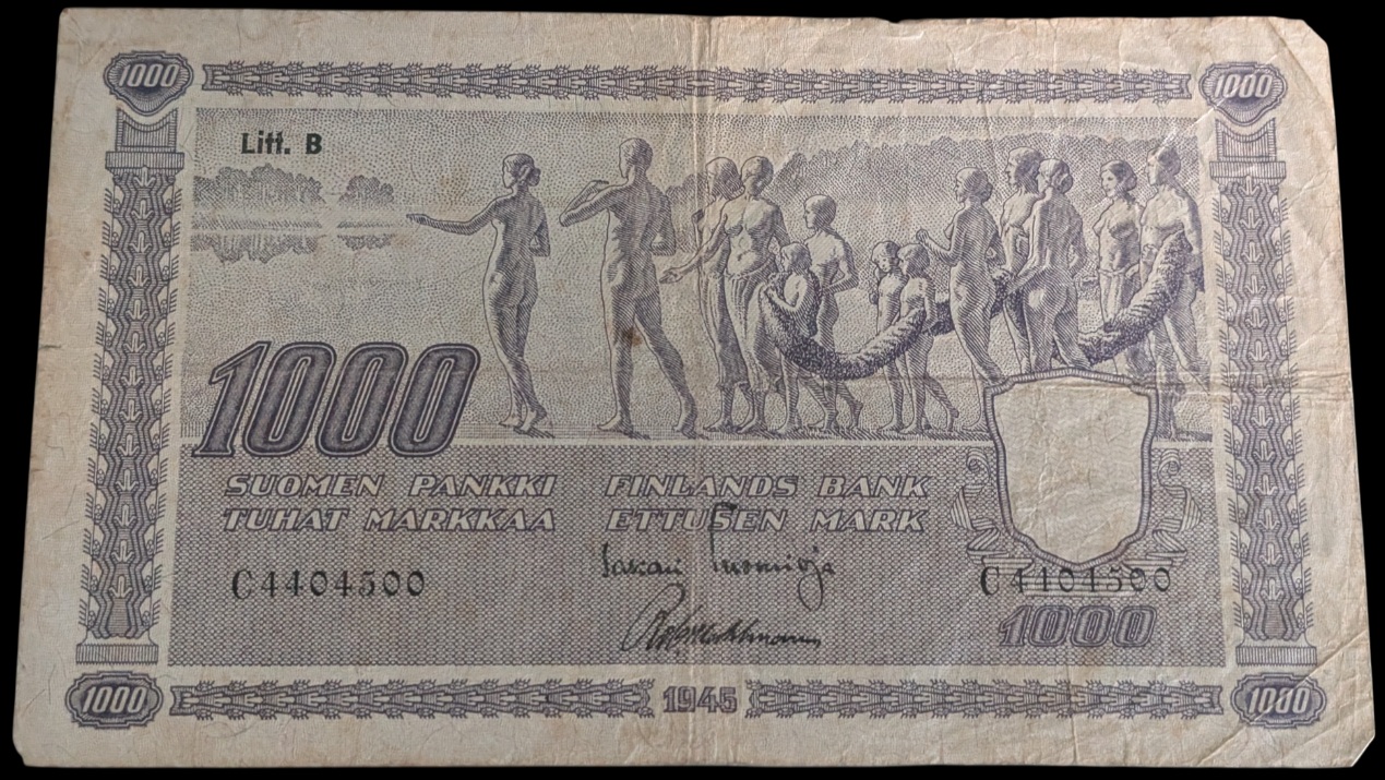 1000 Markkaa 1945 Litt. B C4404500 Tuomioja – Wahlman