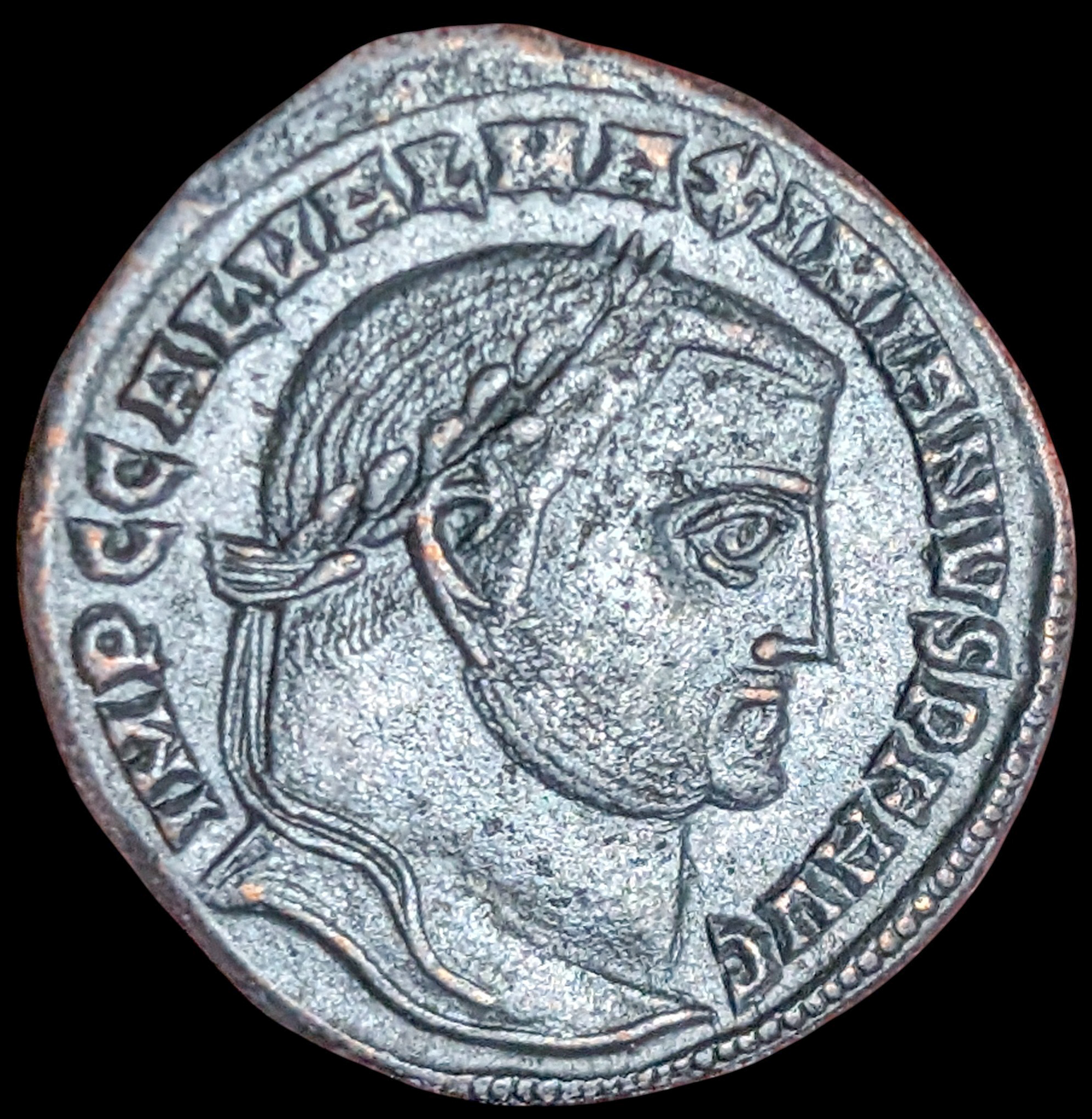 Obv: IMP C GAL VAL MAXIMIANVS P F AVG Laureate head of Galerius to right