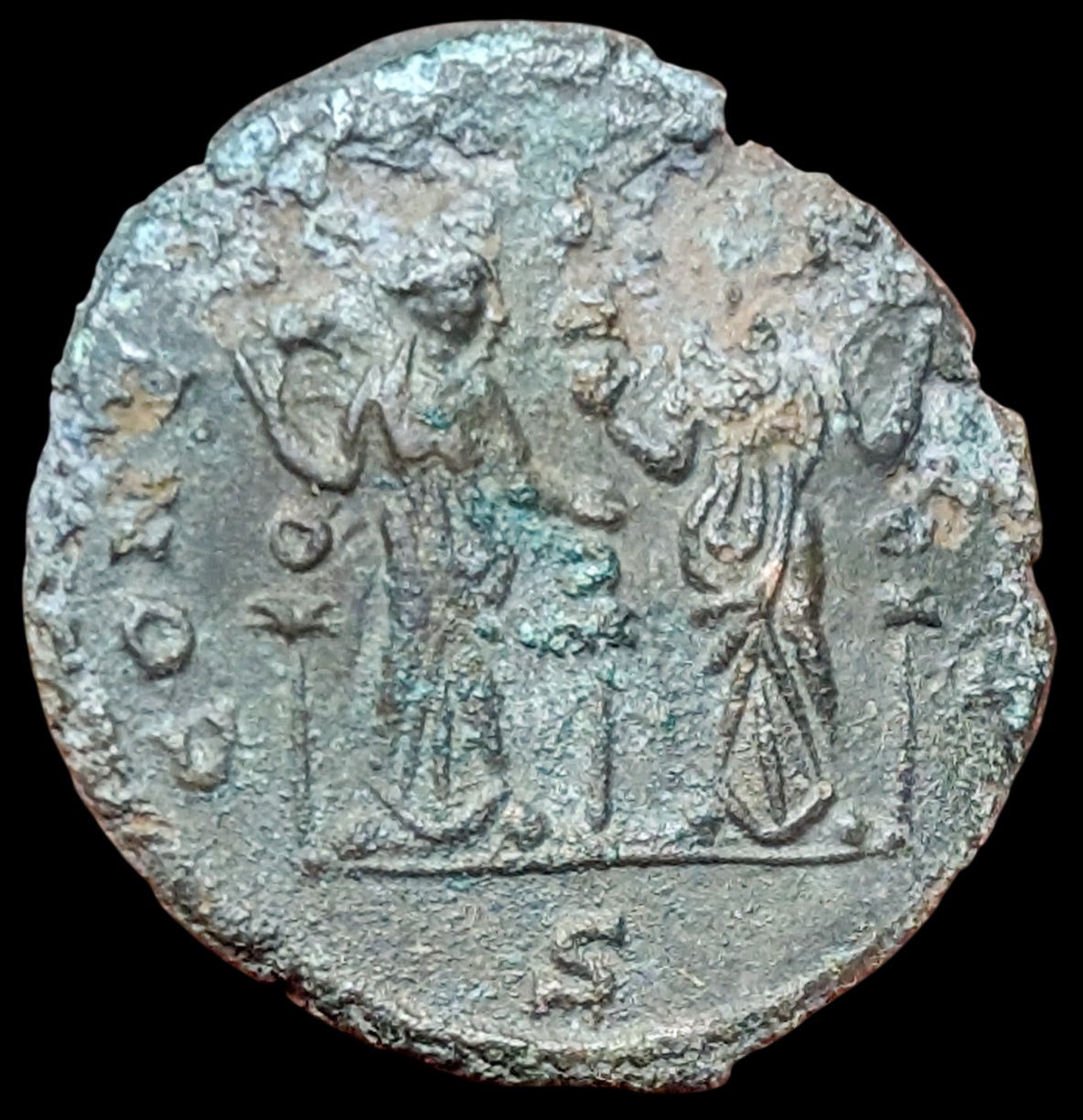 rev: CONCORDIA MILI, Two concordia standing face to face holding three standards, s in ex