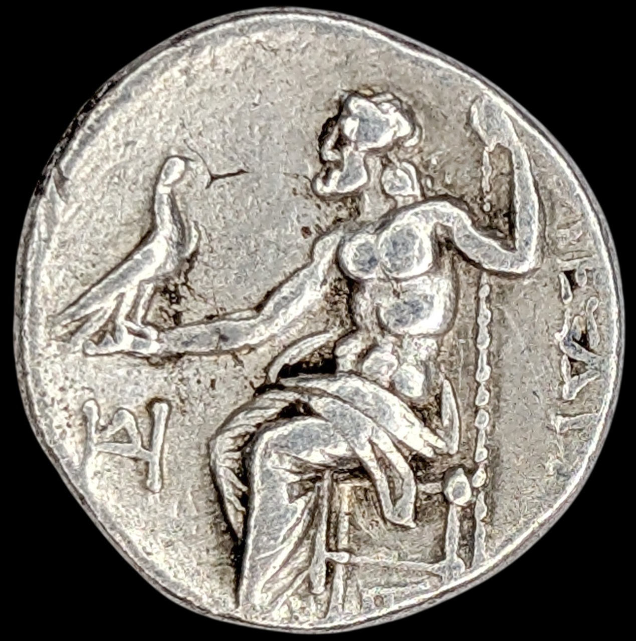 Rev: Zeus seated left, AΛEΞANΔPOY to right, monograms in left field and below throne.