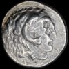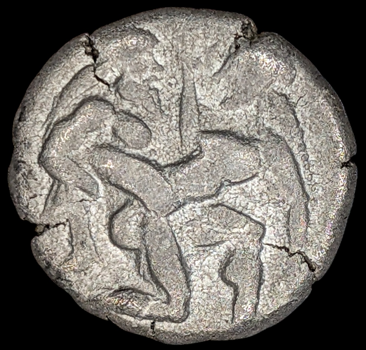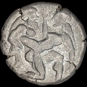 Obv. . Nude, ithyphallic and bearded satyr moving right in the archaic position, holding a nymph in his arms